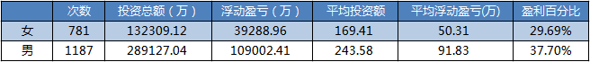 讀懂君獲取了所有公布性別的投資者的數(shù)據(jù),發(fā)現(xiàn)男性平均浮盈37.7%,女性29.69%,當(dāng)然這是假設(shè)至今未賣出股票的情況下的數(shù)據(jù)。但至少在已獲得的1968個(gè)樣中,男性投資眼光顯著高于女性。