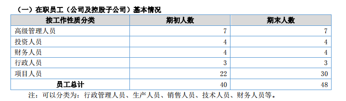 據貫石發(fā)展年報顯示,截止2017年底公司員工總數為48人,其中項目人員30人,高級管理人員7人,投資人員、財務人員、財政人員分別為4人、4人、3人;而2016年末人員更加精簡,僅40人。