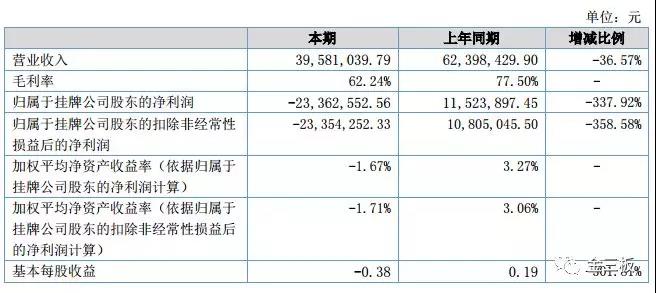 可轉(zhuǎn)過(guò)年來(lái),公司的業(yè)績(jī)卻是“一瀉千里”。上半年,公司營(yíng)業(yè)收入3958.1萬(wàn)元,同比下滑36.57%,凈利直接由盈轉(zhuǎn)虧,虧損額高達(dá)2336.47萬(wàn)元。