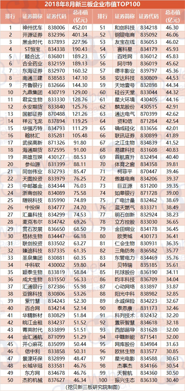 附:2018年8月全國新三板企業(yè)市值TOP100