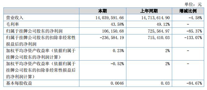 報(bào)告期內(nèi),公司實(shí)現(xiàn)營(yíng)業(yè)收入1,403.96萬元,比上年同期減少4.58%;公司實(shí)現(xiàn)凈利潤(rùn)10.62萬元,比上年同期下降85.37%。?