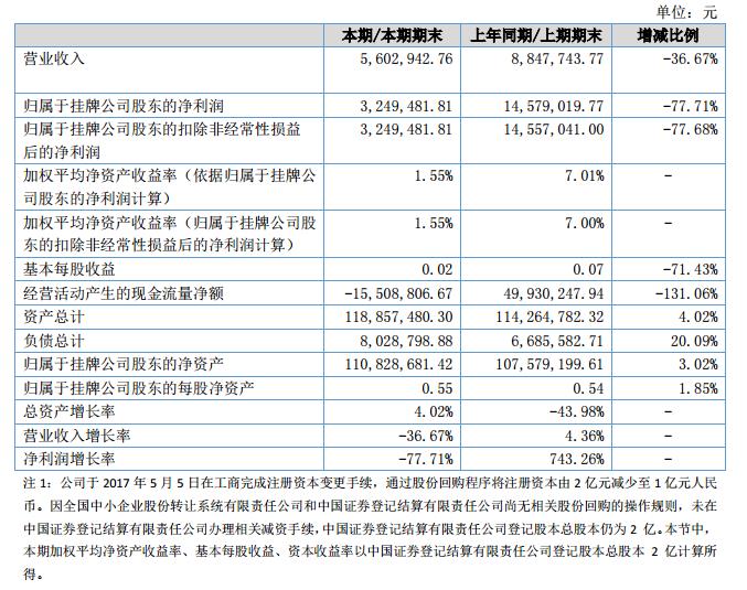 報告期內(nèi)公司營業(yè)收入5,602,942.76元,較上年同期下降36.67%,利潤總額為4,512,587.70元,較上年同期下降76.39%,凈利潤為3249,481.81元,較上年同期下降77.71%?。