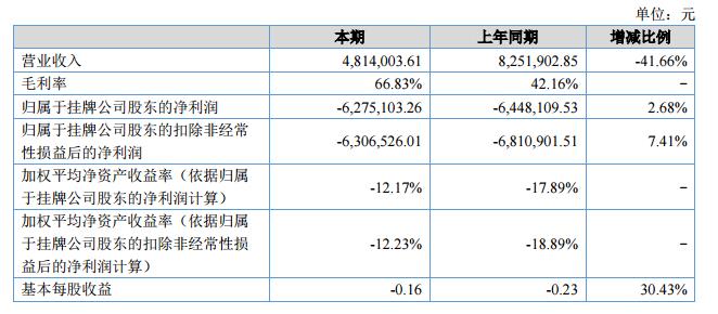 報(bào)告期內(nèi)實(shí)現(xiàn)銷售收入4,814,003.61元,比去年同期8,251,902.85元減少3,437,899.24元,較去年同期減少41.66%;營業(yè)成本1,591,010.17元,比去年同期4,772,699.30元減少3,181,689.13元,較去年同期減少66.66%;?實(shí)現(xiàn)凈利潤-6,275,103.26元,比去年同期凈利潤-6,448,109.53元增加173,006.27元,較去同期增加2.68%。?