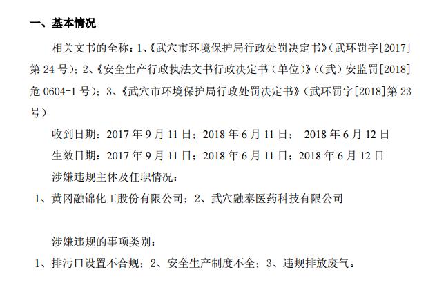 2、2018 年 1 月 22 日、3 月 22 日,武穴市安監(jiān)局安全監(jiān)察人員對黃岡融錦化工股份有限公司進行安全檢查,公司安全制度不全、特種作業(yè)未建立票證制度 等,對公司給予罰款人民幣1萬元的行政處罰;