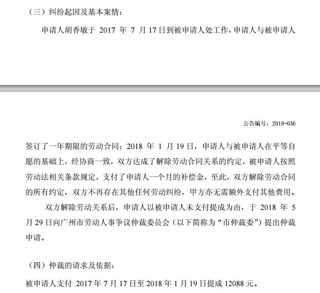 據(jù)介紹, 2017 年 7 月 17 日,胡香敏加入公司,并與公司簽訂了一年期限的勞動合同。2018 年 1 月 19 日,胡香敏與被公司實控人黃志紅在平等自愿的基礎(chǔ)上,經(jīng)協(xié)商一致,雙方達成了解除勞動合同關(guān)系的約定,被公司按照勞動法相關(guān)條款規(guī)定,支付了申請人一個月的補償金,雙方解除勞動合同的所有約定,雙方不再存在其他任何勞動糾紛,甲方亦無需額外支付其他費用。