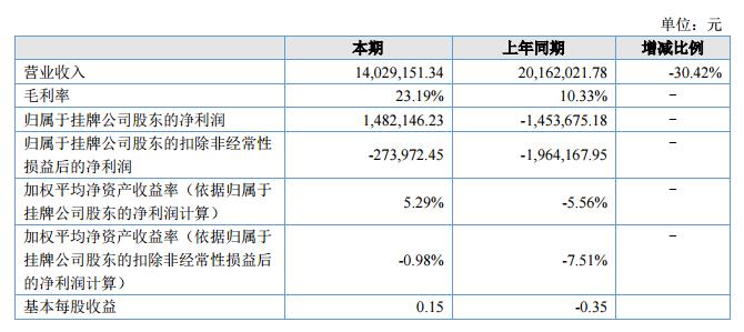 報(bào)告期內(nèi)公司實(shí)現(xiàn)營(yíng)業(yè)收入14,029,151.34元,同比下降30.42%;凈利潤(rùn)1,460,115.95元,同比上升198.48%。?
