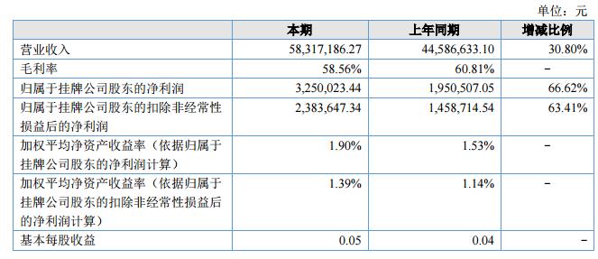 報告期公司主營業(yè)務(wù)與去年同期相比穩(wěn)中有升,實現(xiàn)銷售收入5831.72萬元,比上年同期增長30.80%,歸屬于掛牌公司股東的凈利潤325.00萬元,與上年同期增長66.62%。