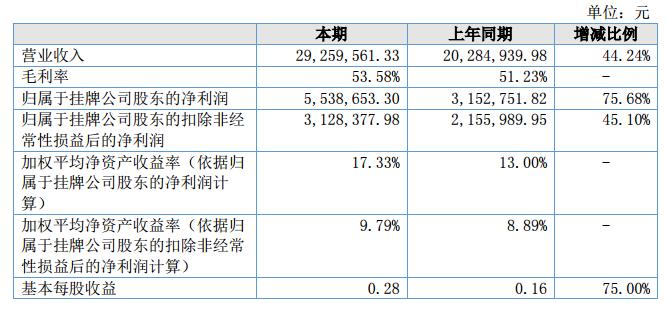 報(bào)告期內(nèi),本期營業(yè)成本為1358.33萬元,較上年同期上升37.31%,主要系本期公司較上年同期銷售收入上升44.24%,相應(yīng)成本增加所致;本期凈利潤為552.74萬元,較上年同期上升68.75%,主要原因系營業(yè)收入大幅增加,導(dǎo)致凈利潤也有所增加,同時獲取政府補(bǔ)貼部分同比增長58.91%所致。?