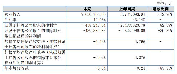 報(bào)告期內(nèi)實(shí)現(xiàn)營業(yè)收入7,650,765.06元,較去年同期營業(yè)收入8,784,093.94元,下降1,133,328.88元,歸屬于掛牌公司凈利潤-438,243.64元,相比去年凈利潤-2,488,323.79元減少2,050,080.15元,經(jīng)營活動(dòng)產(chǎn)生的現(xiàn)金流量?jī)纛~為-2,309,556.75元。?