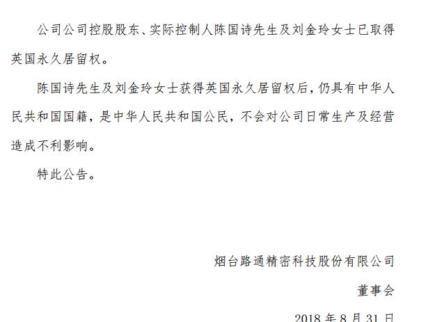據(jù)介紹,路通精密控股股東、實際控制人陳國詩及劉金玲已取得英國永久居留權(quán)。