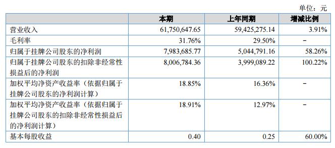 公司實(shí)現(xiàn)營業(yè)收入61,750,647.65元,同比增長3.91%;營業(yè)總成本為52,143,713.89元,同比減少3.29%;凈利潤7,983,685.77元,同比增長58.26%。?