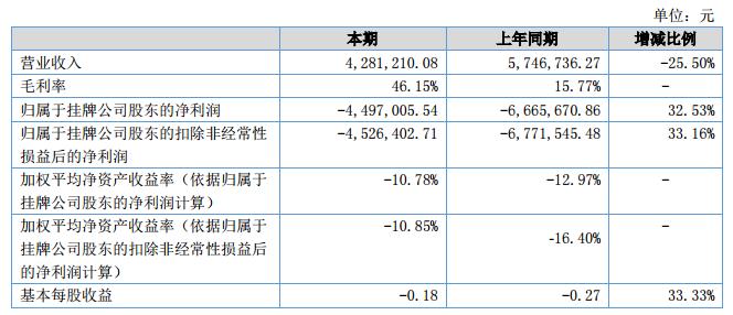 報(bào)告期內(nèi)公司總資產(chǎn)為6,947.10萬元,較上年增加2.20%;實(shí)現(xiàn)營業(yè)收入428.12萬元,較上年同期下降25.50%;營業(yè)成本為230.53萬元,較上年同期下降52.38%,毛利率為46.15%,較上年同期增長30.38%;凈利潤-449.70萬元,較上年同期增加32.53%;經(jīng)營活動(dòng)產(chǎn)生的現(xiàn)金流量凈額為248.32萬元,較上年同期增加2952.03%。?