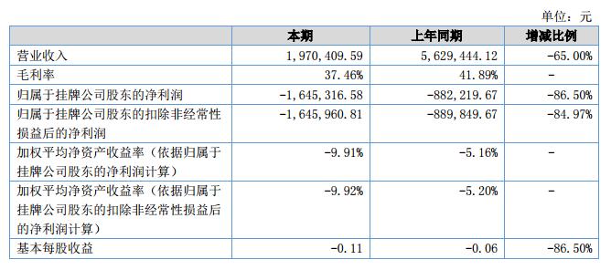 報(bào)告期內(nèi),營(yíng)業(yè)收入為1,970,409.59元,同比減少了65%;毛利率為37.46%;凈利潤(rùn)為-1,645,316.58元,同比減少了86.50%。?
