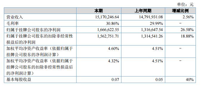 報告期內,營業(yè)收入15,170,246.64元,較上年同期增加378,315.56元,同比增加2.56%;凈利潤1,666,622.55元,較上年同期增加349,975.01元,同比增加26.58%。?