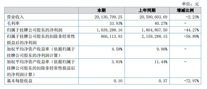 報(bào)告期內(nèi),公司實(shí)現(xiàn)營業(yè)收入20,130,799.25元,同比減少2.23%;營業(yè)成本為13,301,002.15元,同比增長8.16%,主要原因是原材料大幅上漲所致;歸屬于掛牌公司股東的凈利潤為1,039,288.16元,同比減少44.27%,主要原因是報(bào)告期內(nèi),各項(xiàng)原材料大幅上漲,導(dǎo)致毛利率減少所致。?