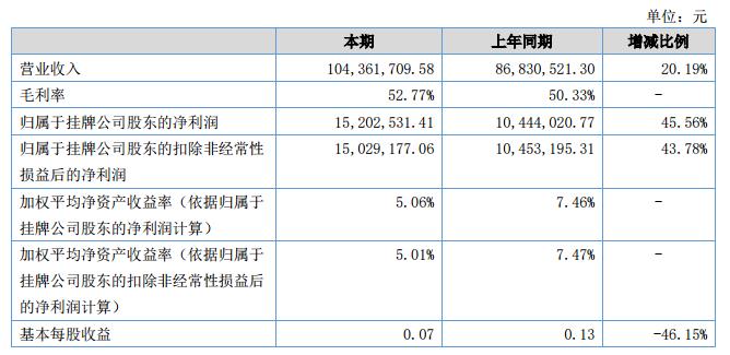 挖貝網(wǎng)9月3日,奧特美克(證券代碼:430245)近日公布的2018年半年報(bào)顯示,截至2018年6月30日,企業(yè)實(shí)現(xiàn)營(yíng)收1.04億元;歸屬于掛牌公司股東的凈利潤(rùn)為1520.25萬元。