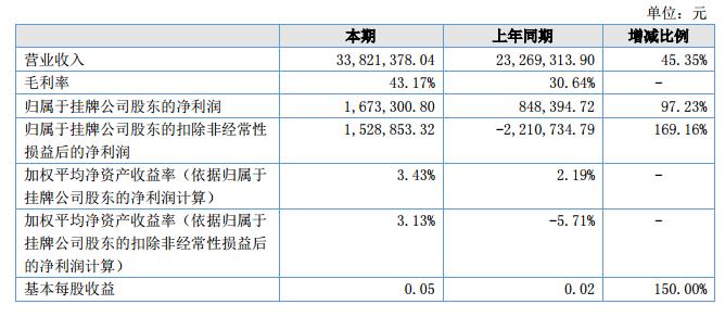 報告期內,三合股份實現(xiàn)營業(yè)收入33,821,378.04元,同比增長45.35%;歸屬于公司股東的凈利潤1,673,300.80元,同比增長97.23%,公司歸屬于掛牌公司股東的扣除非經(jīng)常性損益后的凈利潤為1,528,853.32元,同比增長169.16%,經(jīng)營活動產(chǎn)生的現(xiàn)金流量凈額6,835,126.27,同比下降39.01%。?