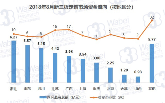 上月,新三板定增市場上,吸引資金排名前三的地區(qū)是浙江、山東和四川,三地共募資16.99億元,占新三板企業(yè)募資總額的40.4%。