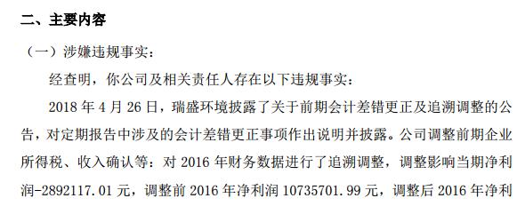 據(jù)全國股轉(zhuǎn)公司披露,經(jīng)查明,2018年4月26日瑞盛環(huán)境披露了關(guān)于前期會計差錯更正及追溯調(diào)整的公告,將2015-2016年的利潤各調(diào)低了150萬和289萬,并調(diào)整前期企業(yè)所得稅、收入確認等。