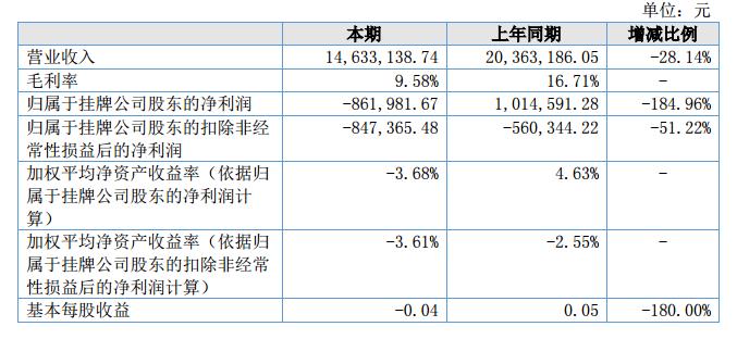 報(bào)告期內(nèi)公司實(shí)現(xiàn)營(yíng)業(yè)收入1,463.31萬(wàn)元,營(yíng)業(yè)成本1,323.15萬(wàn)元,較上期營(yíng)業(yè)成本減少了372.95萬(wàn)元,減少比例為21.99%,凈利潤(rùn)-86.20萬(wàn)元,較上期凈利潤(rùn)101.46萬(wàn)元減少了187.66萬(wàn)元,減少比例為184.96%。