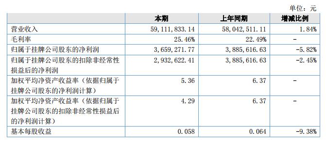 報告期內公司營業(yè)收入59,111,833.14元,增加率為1.84%;營業(yè)成本44,061,094.96元,較上年同期減少2.06%;凈利潤3,659,271.77元,增長率為5.82%;公司總資產211,852,197.43元,增長率為5.94%;經營活動產生的現(xiàn)金流量凈額8,903,277.80元,較上年同期增加8.65%。?
