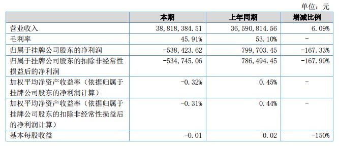 報告期內(nèi),公司實現(xiàn)營業(yè)收入3,881.84萬元,較上年同期增加222.76萬元?,增長6.09%;歸屬于母公司所有者的凈利潤-53.84萬元,較上年同期下降了167.33%。?