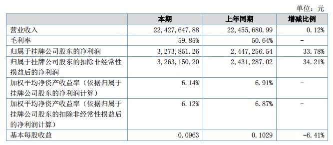 報(bào)告期內(nèi),營(yíng)業(yè)收入較去年同期基本持平,毛利率59.85%,較去年同期的50.64%略有提高;扣除非經(jīng)常性損益后的凈利潤(rùn)3,263,150.20元,較去年同期的2,431,287.02元增長(zhǎng)34.21%。?