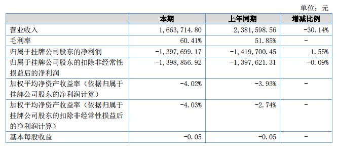 報(bào)告期內(nèi),公司實(shí)現(xiàn)營(yíng)業(yè)收入166.37萬(wàn)元,比上年同期下降30.14%;凈利潤(rùn)-139.77萬(wàn)元,比上年同期增長(zhǎng)1.55%。?