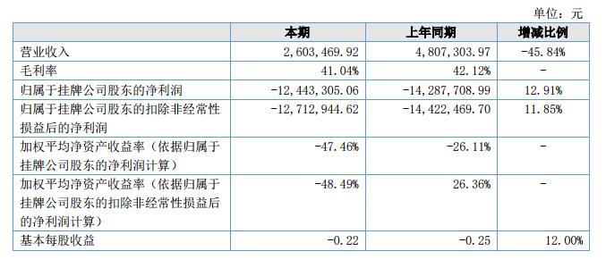 報(bào)告期內(nèi)營(yíng)業(yè)收入2,603,469.92元,較上年同期減少45.84%;營(yíng)業(yè)成本1,534,876.07元,較上年同期減少44.83%;利潤(rùn)總額-12,452,358.31元,較上年同期降低虧損12.78%;凈利潤(rùn)-12,443,305.06元,較上年同期降低虧損12.91%,系報(bào)告期內(nèi)公司為降低運(yùn)營(yíng)成本及費(fèi)用支出,導(dǎo)致業(yè)務(wù)規(guī)??s小。?