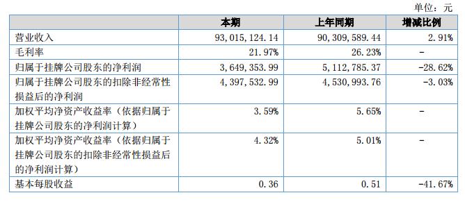 報(bào)告期內(nèi)公司實(shí)現(xiàn)營業(yè)收入93,015,124.14元,上年同期營業(yè)收入為90,309,589.44元,較上年同期增2.91%;報(bào)告期內(nèi)歸屬于掛牌公司股東的凈利潤為3,649,354.00元,上年同期歸屬于掛牌公司股東的凈利潤為5,112,785.37元,較上年同期下降28.62%。?