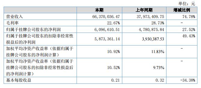 報(bào)告期內(nèi),公司實(shí)現(xiàn)營業(yè)收入66,370,036.47元,較上期增加28,396,626.72元,增幅74.78%;報(bào)告期內(nèi),公司實(shí)現(xiàn)凈利潤6,096,610.51元,較上期增加1,315,734.67元,增幅27.52%。?