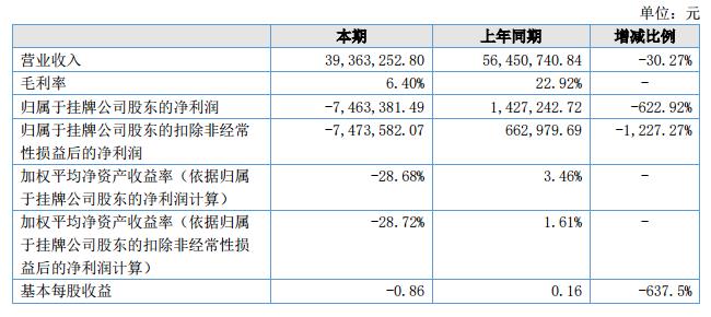 報告期內,公司的營業(yè)收入為39,363,252.80元,較去年同期減少17,087,488.04元,增長比例為-30.27%;歸屬掛牌公司股東的凈利潤為-7,463,381.49元,較去年同期1,427,242.72元,下降了622.92%。?
