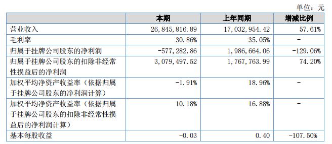 報(bào)告期公司營(yíng)業(yè)收入26,845,816.89元,同比增長(zhǎng)57.61%。本期歸屬于掛牌公司股東的凈利潤(rùn)為-577,282.86元,同比下降129.06%,主要系股份支付確認(rèn)管理費(fèi)用所致。?