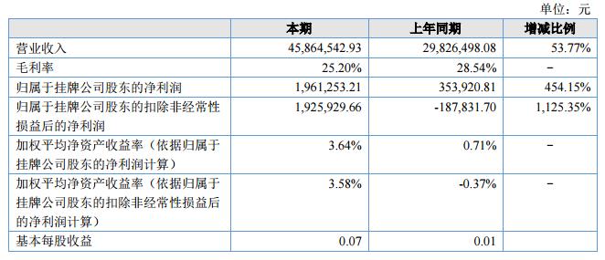 報(bào)告期內(nèi),公司實(shí)現(xiàn)主營(yíng)業(yè)務(wù)收入4,586.45萬(wàn)元,與去年同期相比增長(zhǎng)53.77%;營(yíng)業(yè)成本3,430.72萬(wàn)元,與去年同期相比增長(zhǎng)60.95%;實(shí)現(xiàn)歸屬于股東的凈利潤(rùn)196.13萬(wàn)元,與去年同期相比增長(zhǎng)454.15%。?