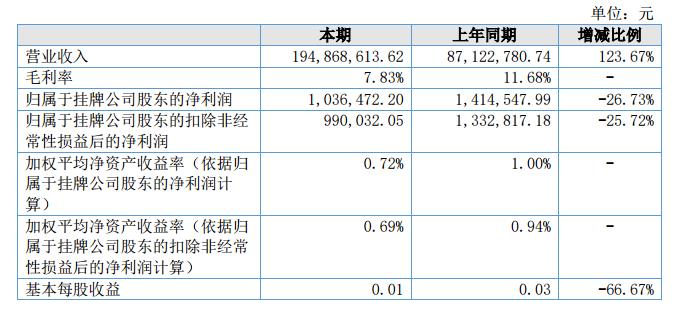 報告期內(nèi)實現(xiàn)營業(yè)收入194,868,613.62元,同比增長123.67%,營業(yè)成本179,617,764.16元,同比增長133.43%;實現(xiàn)凈利潤1,461,571.28元,同比下降36.33%。?
