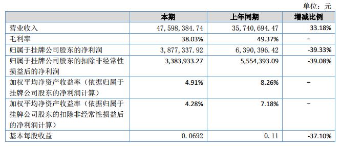 報告期內(nèi),公司實(shí)現(xiàn)營業(yè)收入 47,598,384.74 元,較上年同期增長 33.18%;凈利潤 3,877,337.92 元,較上年同期的 6,390,396.42 減少了 39.33%。?