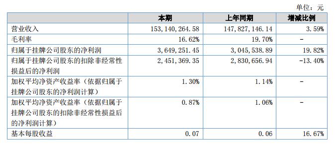 報告期內(nèi),2018年上半年實(shí)現(xiàn)營業(yè)收入15,314.03萬元,營業(yè)收入相比去年同期增長3.59%;凈利潤為352.64萬元,較去年同期增加16.83%。?