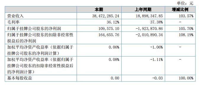 報(bào)告期內(nèi)公司營業(yè)收入達(dá)到38,472,285.24元,較2017年度同期增長103.57%;凈利潤實(shí)現(xiàn)109,575.10元,較2017年度同期增長105.70%。?