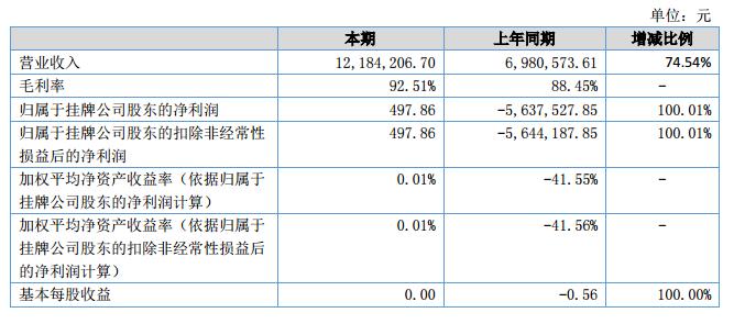 報告期內(nèi),公司實現(xiàn)營業(yè)收入1,218.42萬元,比上年同期增長74.54%。2018年上半年,企業(yè)實現(xiàn)歸屬于掛牌公司股東的凈利潤為0.05萬元,比上年同期增長100.01%;截至2018年6月30日,公司注冊資本1,000萬元,資產(chǎn)總額為368.64萬元,負債總額732.29萬元,凈資產(chǎn)-363.65萬元。?