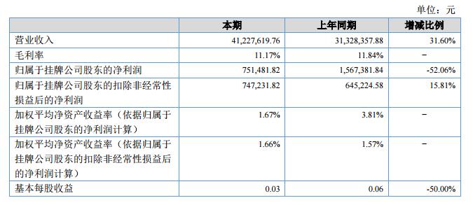 報告期內(nèi)公司實現(xiàn)營業(yè)收入41,227,619.76元,同比上升31.60%?。