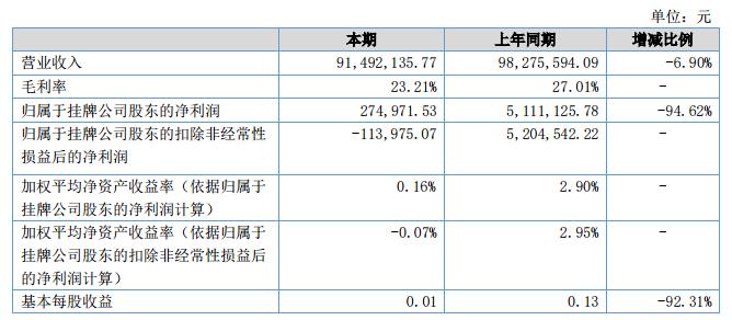 報(bào)告期內(nèi)公司總資產(chǎn)305,763,876.15元,同比增長(zhǎng)14.74%,歸屬于掛牌公司凈資產(chǎn)168,238,681.42元,同比上年增長(zhǎng)-0.20%。報(bào)告期內(nèi)實(shí)現(xiàn)銷售收入91,492,135.77元,同比上年下降-6.90%,歸屬于掛牌公司股東的凈利潤(rùn)274,971.53元,同比增長(zhǎng)-94.62%。?