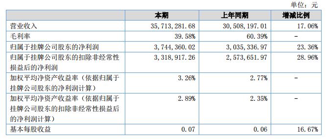 報(bào)告期內(nèi),公司實(shí)現(xiàn)營(yíng)業(yè)收入3,571.33萬元,比上年同期增長(zhǎng)了17.06%;報(bào)告期實(shí)現(xiàn)歸屬于公司普通股股東的凈利潤(rùn)374.44萬元,比上年同期增長(zhǎng)了23.36%;本期毛利率39.58%,較上年同期毛利率60.39%。?
