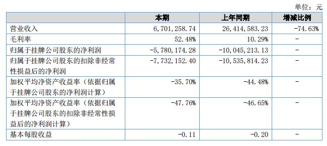 報(bào)告期內(nèi)主營(yíng)業(yè)務(wù)收入為670.13萬(wàn)元,較上年同期減少74.63%?;凈利潤(rùn)虧損578.01萬(wàn)元。?