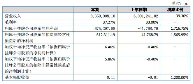 報(bào)告期內(nèi),公司實(shí)現(xiàn)營(yíng)業(yè)收入8,359,908.10元,較上年同期增長(zhǎng)39.30%。凈利潤(rùn)為675,297.88元,較去年同期增長(zhǎng)1716.75%。?