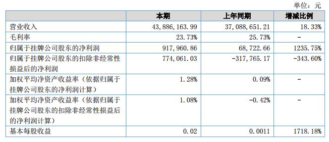 報告期內(nèi)公司營業(yè)務(wù)收入為43,886,163.99元,同期增長18.33%;營業(yè)成本為33,472,973.28元,同期增漲21.52%;歸屬于母公司的凈利潤為917,960.86元,同期增漲1235.75%。