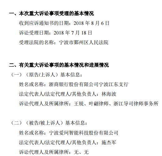 2018 年 7 月 18 日,浙商銀行將愛(ài)珂科技告上法庭,要求愛(ài)珂科技立即償還借款本金 550萬(wàn)元,并支付利息5.76萬(wàn)元、 復(fù)利 389.38 元,暫合計(jì) 5557993.15 元。要求判令對(duì)抵押的7套房產(chǎn)進(jìn)行拍賣(mài)。