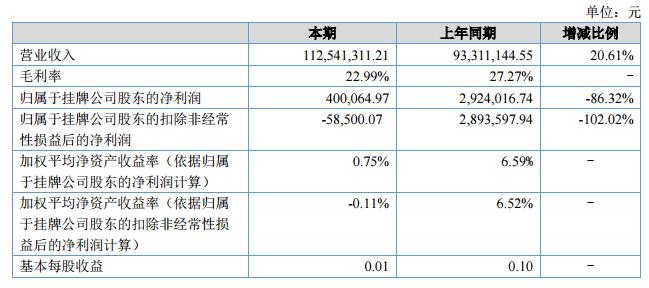 報告期內(nèi),公司總資產(chǎn)為195,281,673.40元,比上年期末增長6.04%;歸屬于掛牌公司股東的凈資產(chǎn)為53,362,330.54元,比上年期末增長0.86%;公司本年度實現(xiàn)營業(yè)收入112,541,311.21元,比上年同期增長20.61%;實現(xiàn)歸屬于掛牌公司股東的凈利潤400,064.97元,比上年同期下降86.32%。