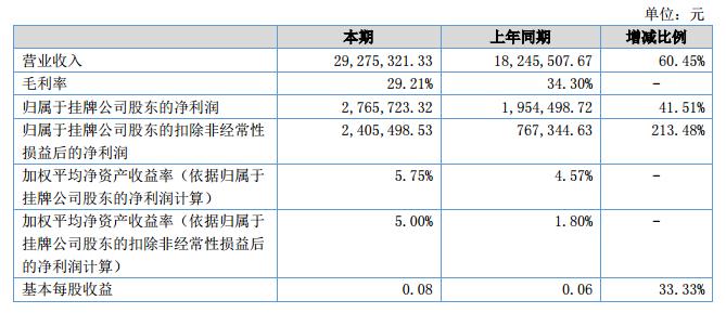 公司在報(bào)告期內(nèi)的營(yíng)業(yè)收入為2,927.53萬(wàn)元,比上年度同期增長(zhǎng)60.45%,營(yíng)業(yè)成本為2,072.43萬(wàn)元,比上年同期增長(zhǎng)72.89%,歸屬于母公司的凈利潤(rùn)為276.57萬(wàn)元,比上年同期增長(zhǎng)41.51%。?