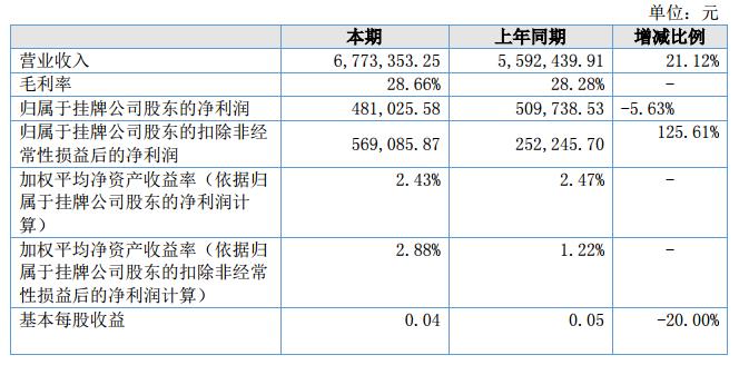 報告期內(nèi)公司營業(yè)收入677.33萬元,較上期同比增加21.12%;報告期內(nèi)公司凈利潤為42.74萬元,較上期減少5.89%。?