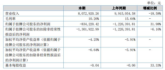 報(bào)告期末資產(chǎn)總額23,342,560.37元,較上年期末的24,300,960.41減少3.93%。負(fù)債總額4,150,357.66元,較上年期末的4,267,937.28元減少2.75%。營業(yè)收入8,072,920.26元,比上期減少18.58%。報(bào)告期內(nèi)凈利潤為-834,220.42元,經(jīng)營活動(dòng)產(chǎn)生的現(xiàn)金流量凈額為-2,553,767.27元。?